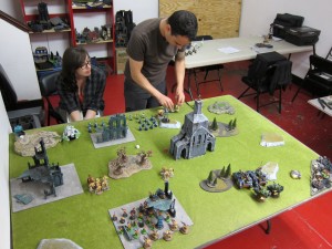 Tonight at PAGE, Jason, Valerie, Colin, and I got in my first match of sixth edition 40k.  Colin and I teamed up for a 2 on 2 of Space Marines and Imperial Guard versus Jason’s Deathwing Dark Angels and Valerie’s Eldar.  It was mostly a learning game as Jason coached Valerie in her very first game of 40k, with Colin also talking up changes for sixth edition.