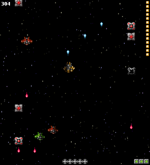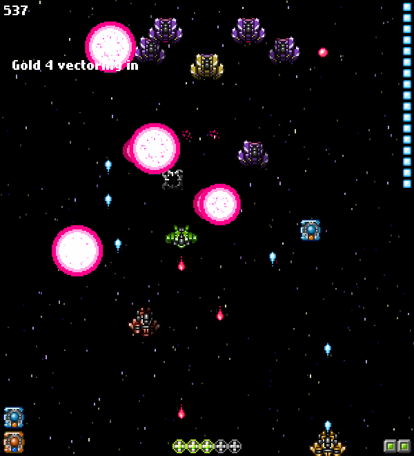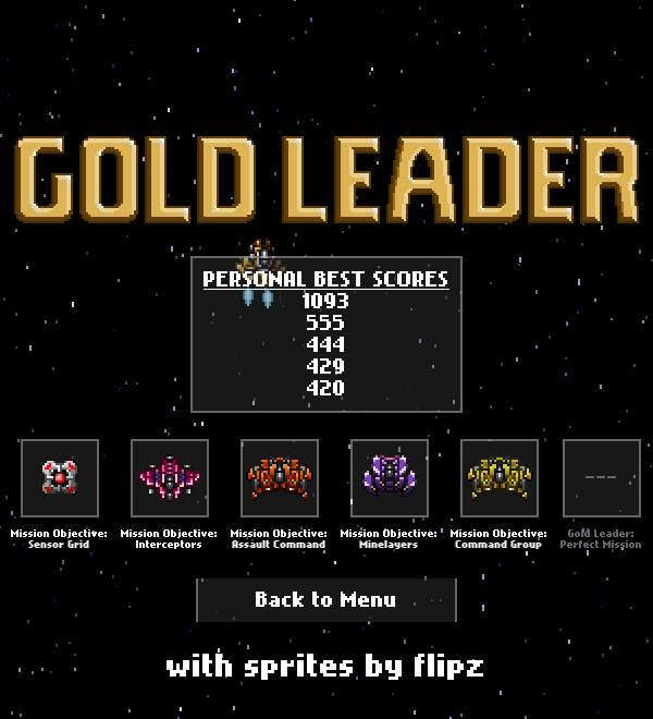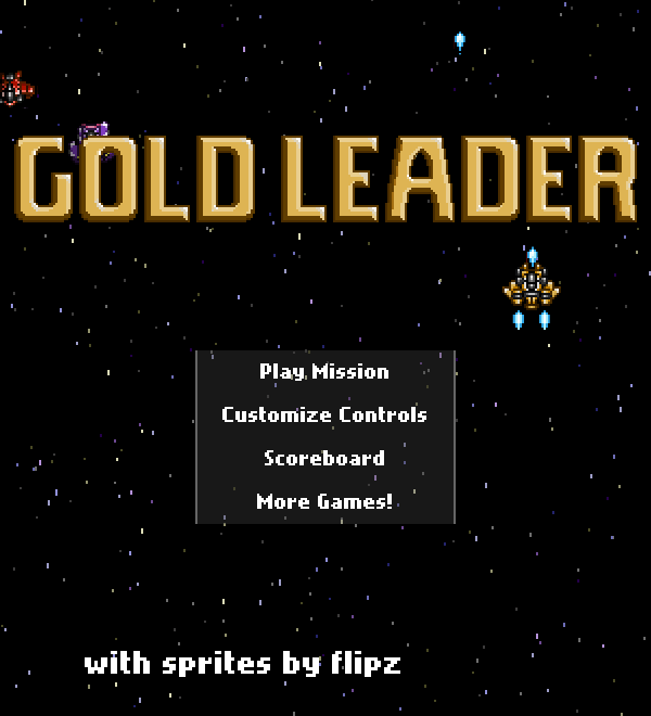 Gold Leader was a traditional pixel art space shoot 'em up videogame, kept lean and simple for players looking to just dive in for a couple minutes now and then to blast things in their spaceship. Players take the part of Gold Leader, sent to stop an oncoming enemy invasion in a super tough, old school mission with several required objectives.